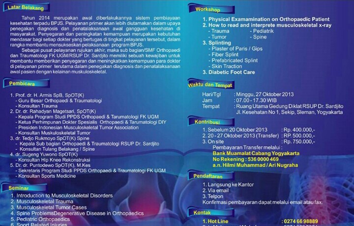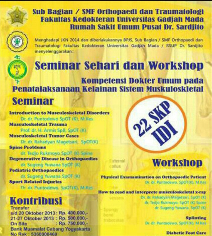 Menghadapi Jaminan Kesehatan Nasional 2014 dan diberlakukannya BPJS, Bagian Orthopaedi &Traumatologi RSUP Dr. Sardjito akan menyelenggarakan Seminar dan Workshop yang bertujuan memberikan freshening dan update ilmu Orthopaedi dan Traumatologi mulai dari Trauma Muskuloskeletal, Spine, Muskuloskeletal Tumor, Degeneratif Orthopaedic, Pediatric Orthopaedic sampai dengan Sport related injuries. Workshop akan lebih menjelaskan physical examination kasus muskuloskeletal, cara membaca dan interpretasi x-ray kasus muskuloskeletal, splinting dan yang sedang trend, perawatan kaki diabetik.