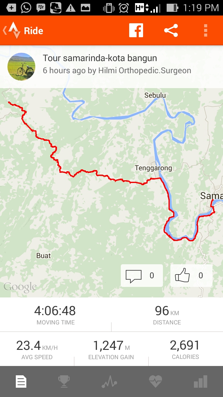 Minggu pagi, 31 mei 2015, rencana pedalling muter kota samarinda saja. Sesampainya di tepian mahakam lihat sekumpulan orang dari grup roadbike, iseng-iseng mampir dan kenalan. Langsung diajakin gabung pedalling menuju Kota Bangun (+-120Km)….weh, tanpa persiapan apapun kecuali botol minuman separuh terisi dan perut keroncongan saya beranikan untuk bergabung. Akhirnya drop out juga di kilometer 96, padahal tinggal 24 Km dari titik akhir di Kota Bangun.